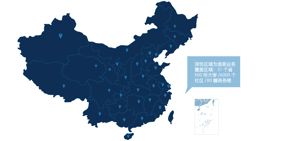 递易自主研发的产品已累计用于500多所大学、80多栋商务楼、6000多个社区网点