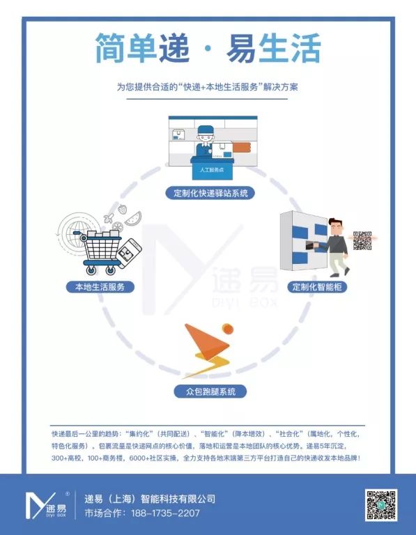 递易始终坚持“拥抱变化、分享利他、共创共赢”的核心理念;始终心怀真诚、友善、服务的态度,团结一切可团结的资源;始终热切欢迎全国各地的末端服务平台、快递网点公司、场景资源方、加盟、代理、快递末端创业团队(个人)与我们联系,共创辉煌。