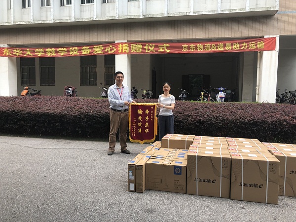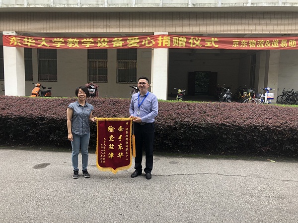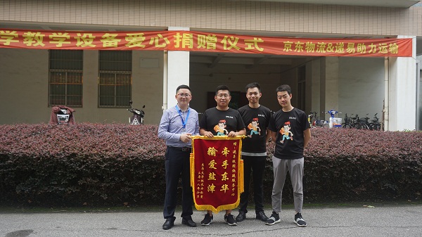 本次公益活动在校长办公室老师的组织下顺利完成,资产管理处骆老师、采购与招投标管理中心翁老师分别向递易和京东物流赠送了锦旗以表谢意。
